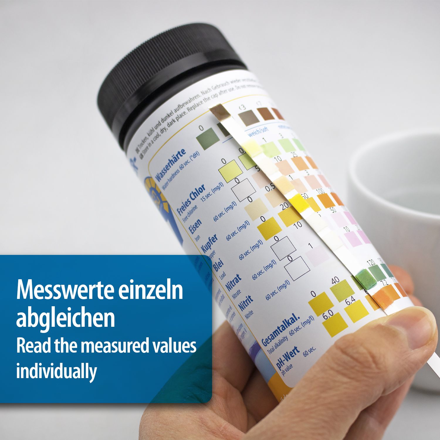 Possono essere utilizzate in casa o in viaggio, in modo da poter testare rapidamente e in modo affidabile la qualità dell'acqua. Le strisce reattive sono adatte per misurare la qualità dell'acqua di rubinetto, fontane, piscine e acquari.