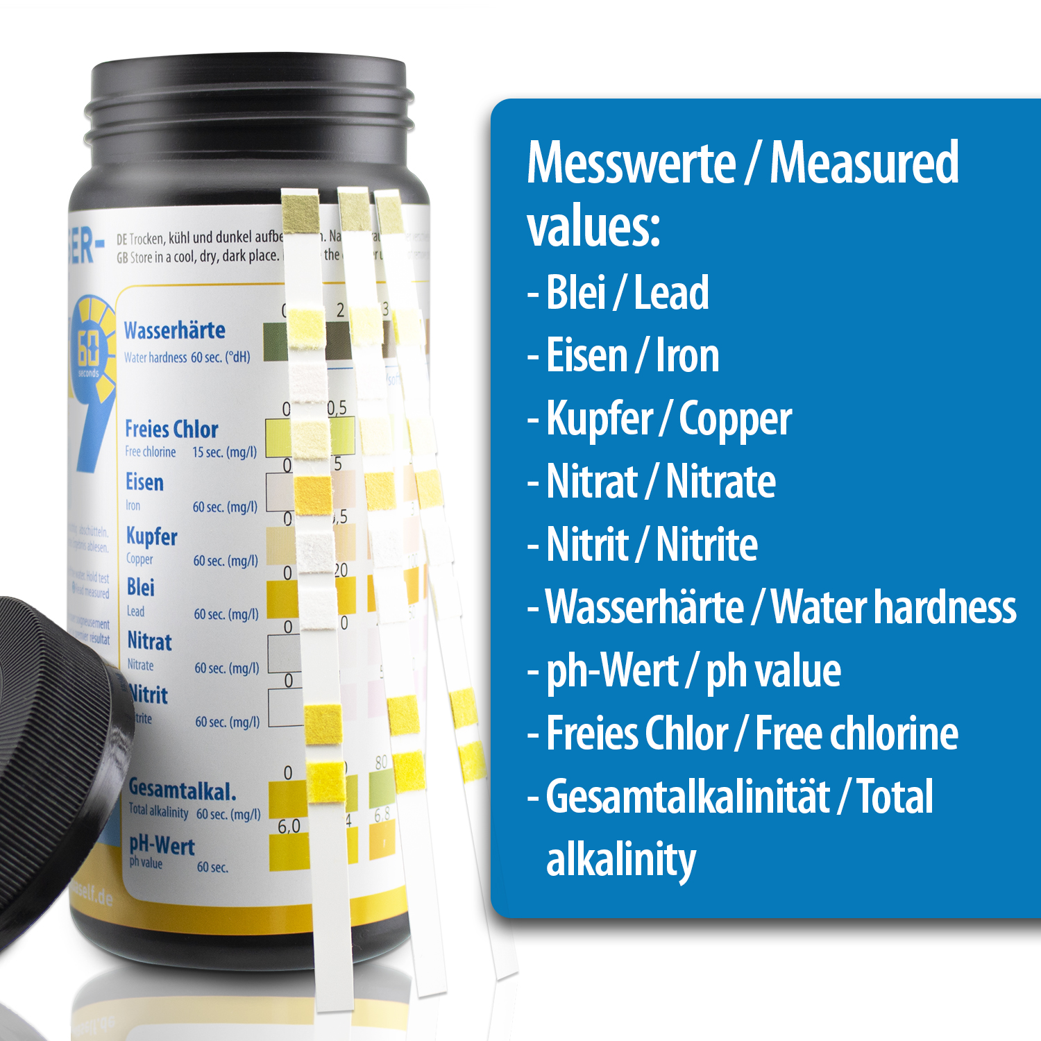 L'acqua può essere bollita per uccidere i batteri, ma i metalli pesanti rimangono comunque nell'acqua. Le strisce reattive 9 in 1 possono essere utilizzate per testare nell'acqua la presenza dei più importanti contaminanti chimici.